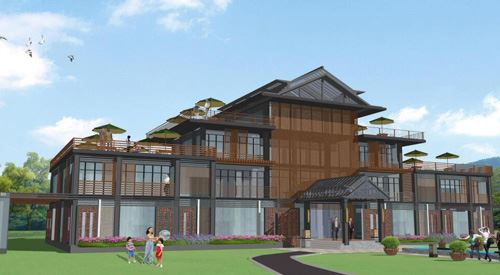 度假酒店周邊環(huán)境整體設計風格定位為簡約大氣。度假酒店前保留一定的草坪面積,使酒店一層窗口有比較開闊的視野和較好的采光。